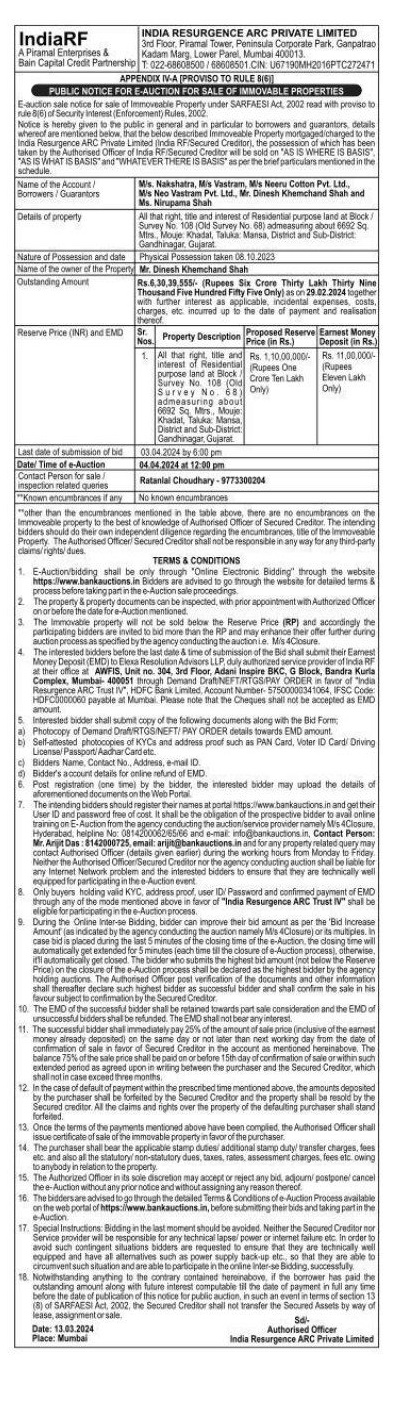 | Schedule of Property: | All that right, title and interest of Residential purpose land at Block/Survey No. 108(Old Survey No. 68) admeasuring about 6692 sq.mtrs., Mouje: Khadat, Taluka: Mansa, District and Sub-District: Gandhinagar , Gujarat. |