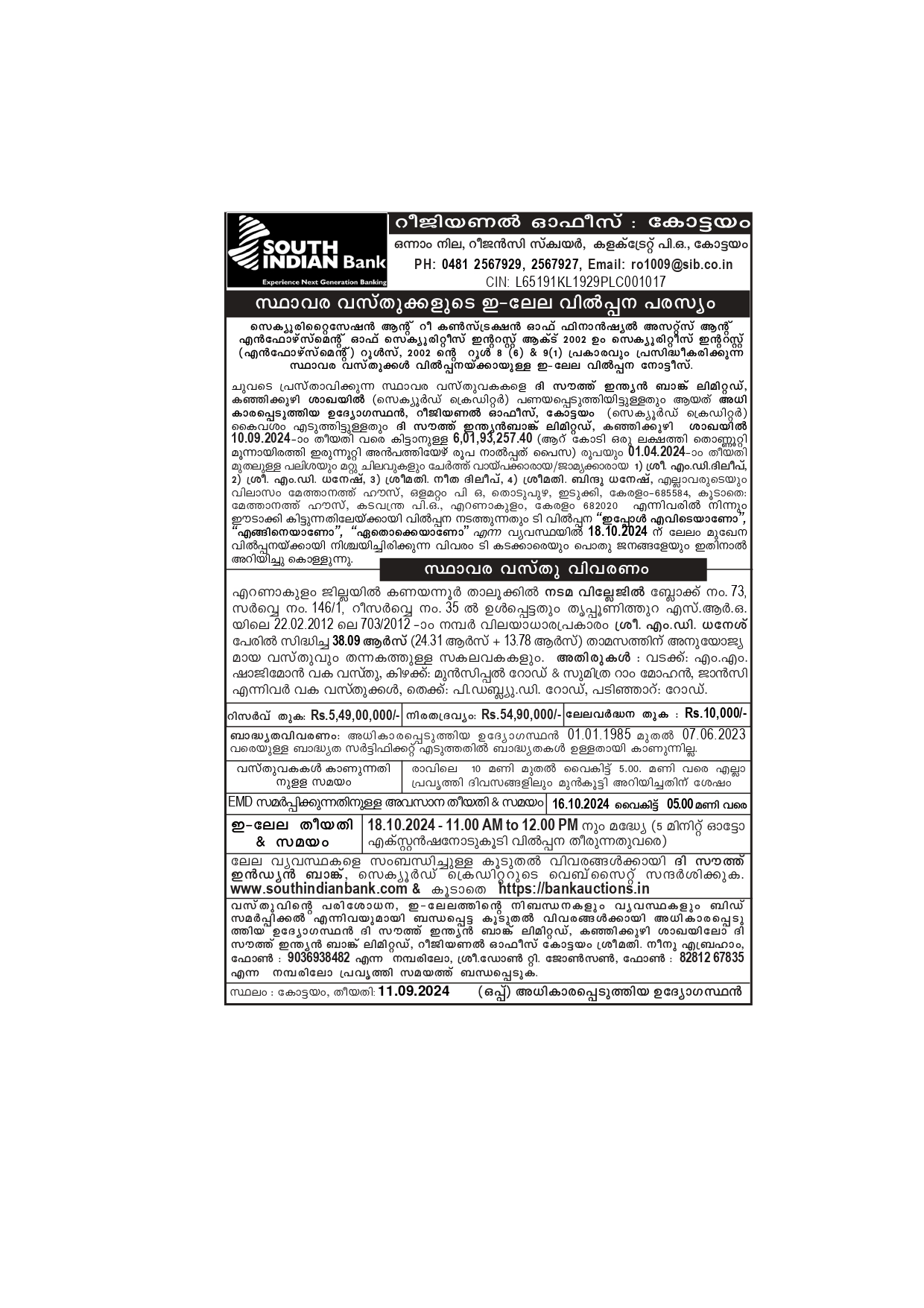 | Inspection Details: | For Inspection : Contact The Authorized Officer : Mrs.Neenu Abraham : 9036938482/ Mr.Don T Johnson 8281267835 |