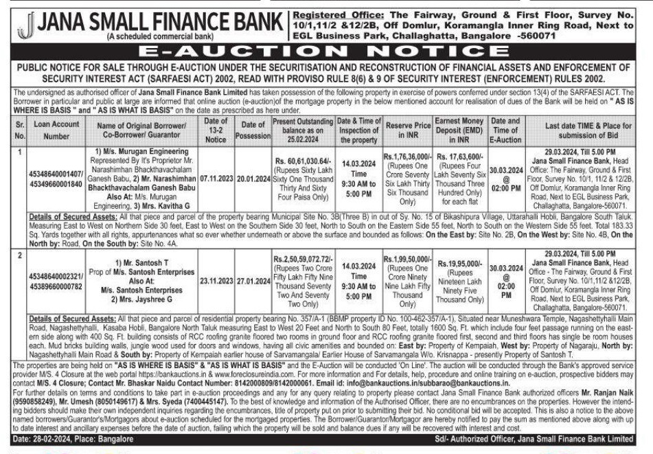 | Schedule of Property: | Details of Secured Assets: All that piece and parcel of residential property bearing No. 357/A-1 (BBMP property ID No. 100-462-357/A-1). Situated near Muneshwara Temple, Nagashettyhall Main Road, Nagashettyhalli, Kasaba Hobli, Bangalore North Taluk measuring East to West 20 Feet and North to South 80 Feet, which include four feet passage running on the east- em side along with 400 Sq. Ft building consists of RCC roofing granite floored two rooms in ground floor and RCC roofing granite floored first, second and third floors has single be room houses each Mud bricks building walls, jungle wood used for doors and windows having all civic amenities and bounded on East by: Property of Kempaiah, West by: Property of Nagaraju, North Nagashettyhall Main Road and South by: Property of Kempaiah earlier house of Sarvamangala/ Earlier House of Sarvamangala W/o. Krisnappa presently Property of Santosh T. |