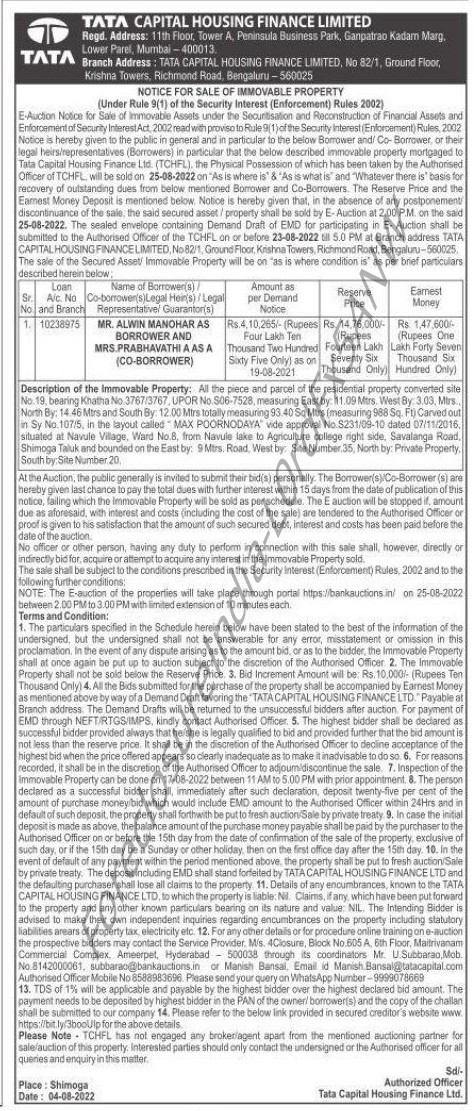 | Contact Details: | Contact The Authorized Officer: Mr Manish Bansal, Mobile No. 8588983696, Email Id: Manish.Bansal@tatacapital.com |