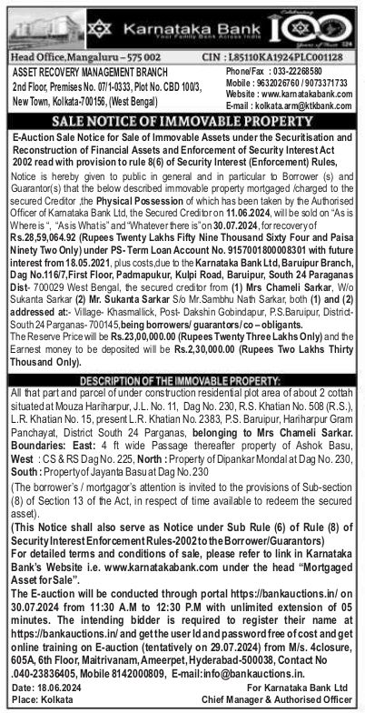 | Schedule of Property: | All that part and parcel of under construction residential plot area of about 2 cottah situated at Mouza Hariharpur, J.L. No. 11. Dag No. 230, R.S. Khatian No. 508 (R.S.). L.R. Khatian No. 15, present L.R. Khatian No. 2383, P.S. Baruipur, Hariharpur Gram Panchayat, District South 24 Parganas, belonging to Mrs Chameli Sarkar. Boundaries: East: 4 ft wide Passage thereafter property of Ashok Basu, West CS and RS DagNo. 225. North Property of Dipankar Mondal at Dag No. 230. South: Property Jayanta Basuat Dag No. 230 |