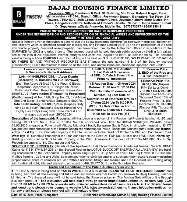 | Contact Details: | Contact The Authorized Officer: Mobile No. 8073273577 /8669189048 |