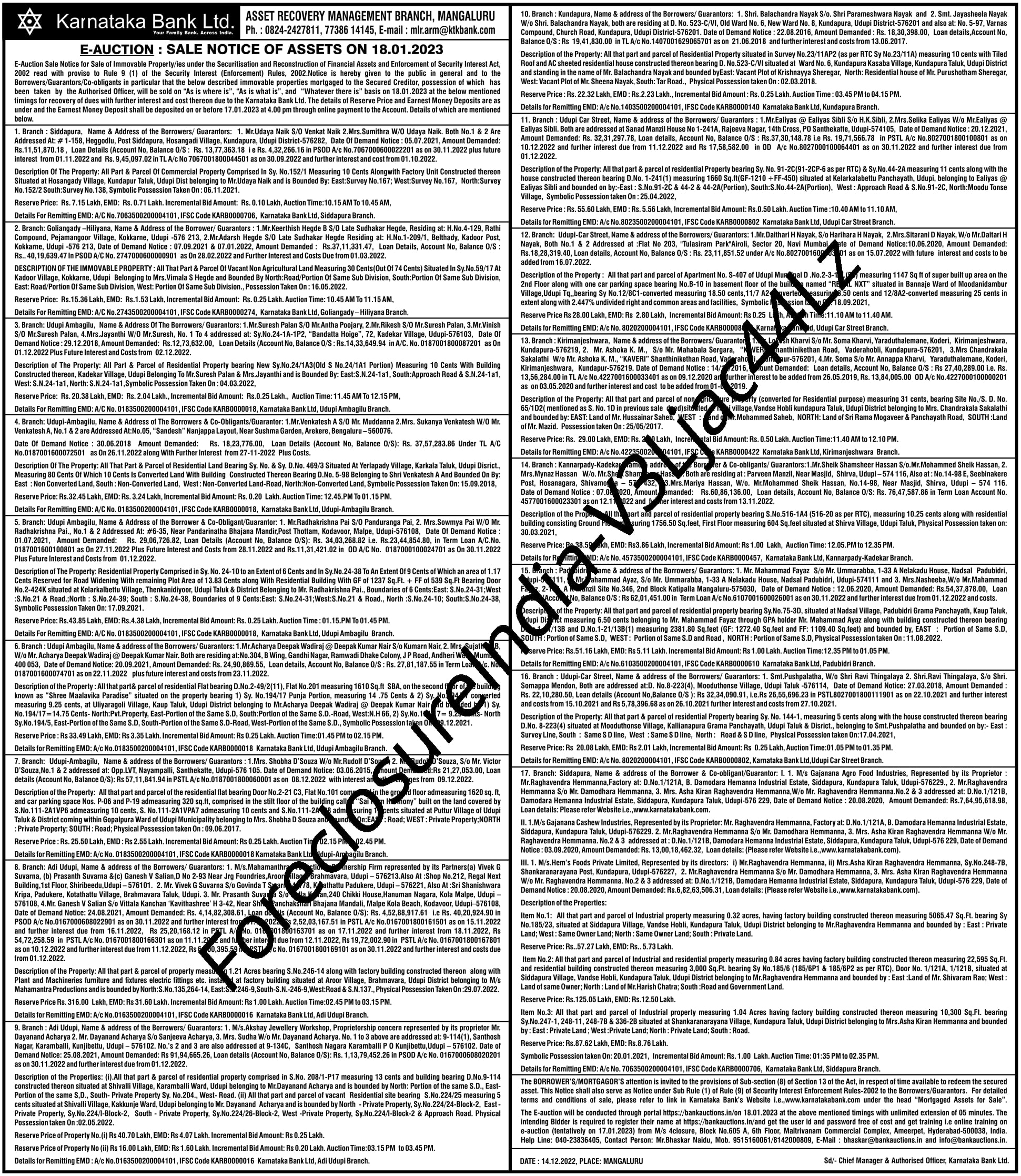 | Contact Details: | Contact The Authorized Officer : 0824-2427811, 7738614145 |