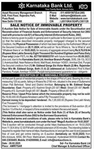 | Start Date and Time of Auction: | 19-03-2025 11:30 am |