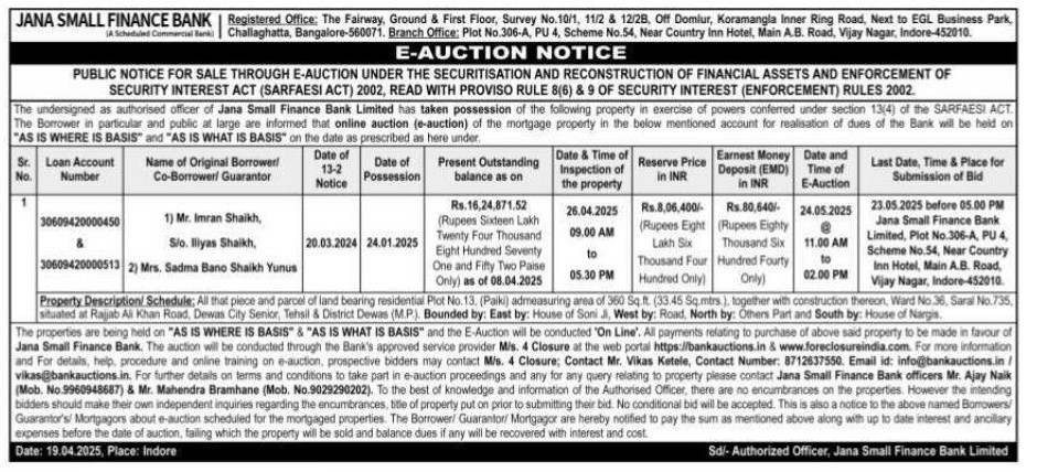 | Schedule of Property: | Property Description Schedule: All that piece and parcel of land bearing residential Plot No.13. (Paiki) admeasuring area of 360 Sq.ft (33.45 Sq.mtrs.). together with construction thereon Ward No 36, Saral No.735 situated at Rajjab Ali Khan Road, Dewas City Senior, Tehsil & District Dewas (M.P.). Bounded by: East by: House of Soni Ji. West by: Road North by: Others Part and South by: House of Nargis. |
