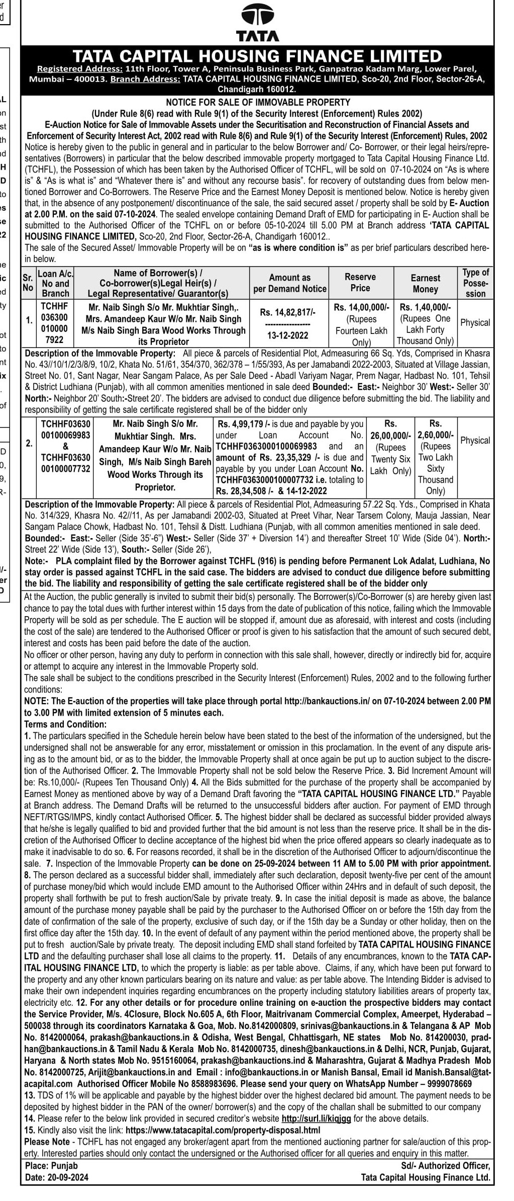 | Contact Details: | Contact The Authorized Officer : Manish Bansal, Email id Manish.Bansal@tatacapital.com8588983696. 9999078669 |