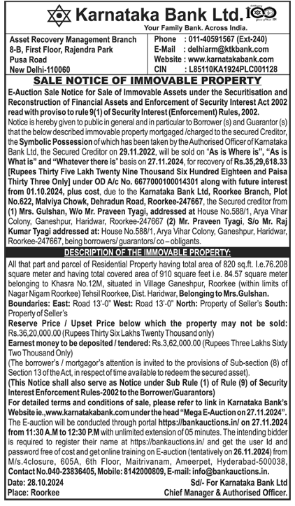 | End Date and Time of Auction: | 27-11-2024 12:30 pm |