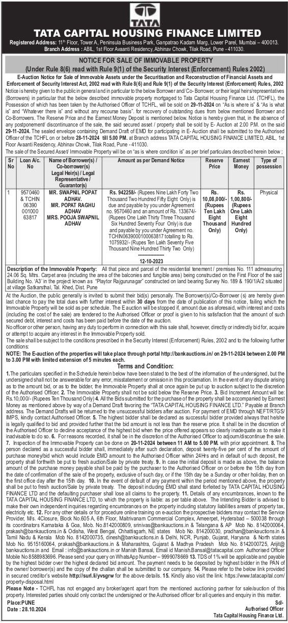 | Contact Details: | Contact The Authorized Officer :Manish Bansal, Email id Manish.Bansal@tatacapital.com Mobile No 8588983696. -9999078669 |