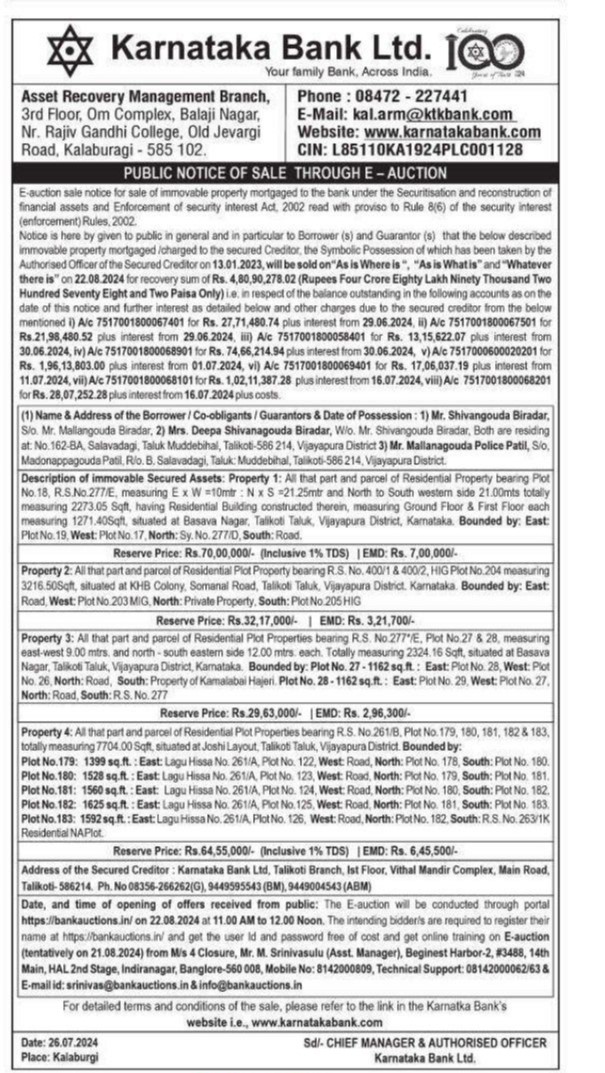 | Contact Details: | Contact the Authorized officer: Phone : 08472 - 227441 E-Mail: kal.arm@ktkbank.com Website: www.karnatakabank.com Ph No 08356-266262(G), 9449595543 9449004543 (ABM) |