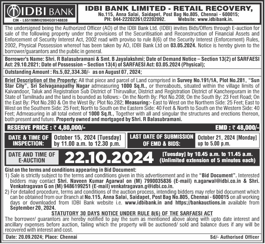 | Contact Details: | Contact The Authorized Officer:044-22202261/ 22202092, www.idbibank.in, Shri. Naveen Kumar Agarwal on (M) 7990035836 (E-mail) n.agarwal@idbi.co.in , Shri.Venkatragavan G on (M) 9486199251 (E-mail) venkatragavan.g@idbi.co.in |