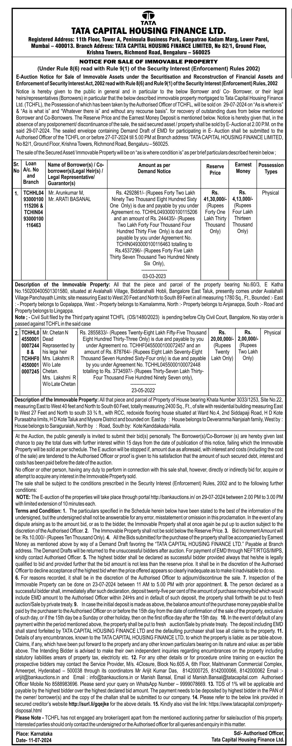| Contact Details: | Contact The Authorized Officer Phno : Manish Bansal, 8588983696 / 9899078669 Email id : Manish.Bansal@tatacapital.com |