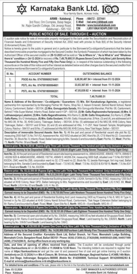 | Schedule of Property: | Item No. 2): All the part and parcel of Residential vacant site bearing assessment no. 48840/40205E, 49845E/18774,49846/E /40206/820 & 48840/402056, 49845E/18774/,49849/E/40206/D4, measuring 3000 Sqft, situated over TS No 83/1820 7 83/2D4, CMC ward No 258, corporation ward no 32, CTS ward no 22, Block No 10, beside Ramnagar, fort ring road, Ballari belonging to Mrs. Sarada G and bounded by East: Road-T.S.NO.82, West: T.S.No. 83/203 & 83/18/19, North: T.S.No.83/1 B11-Road and South: T.S. No. 83/208. |
