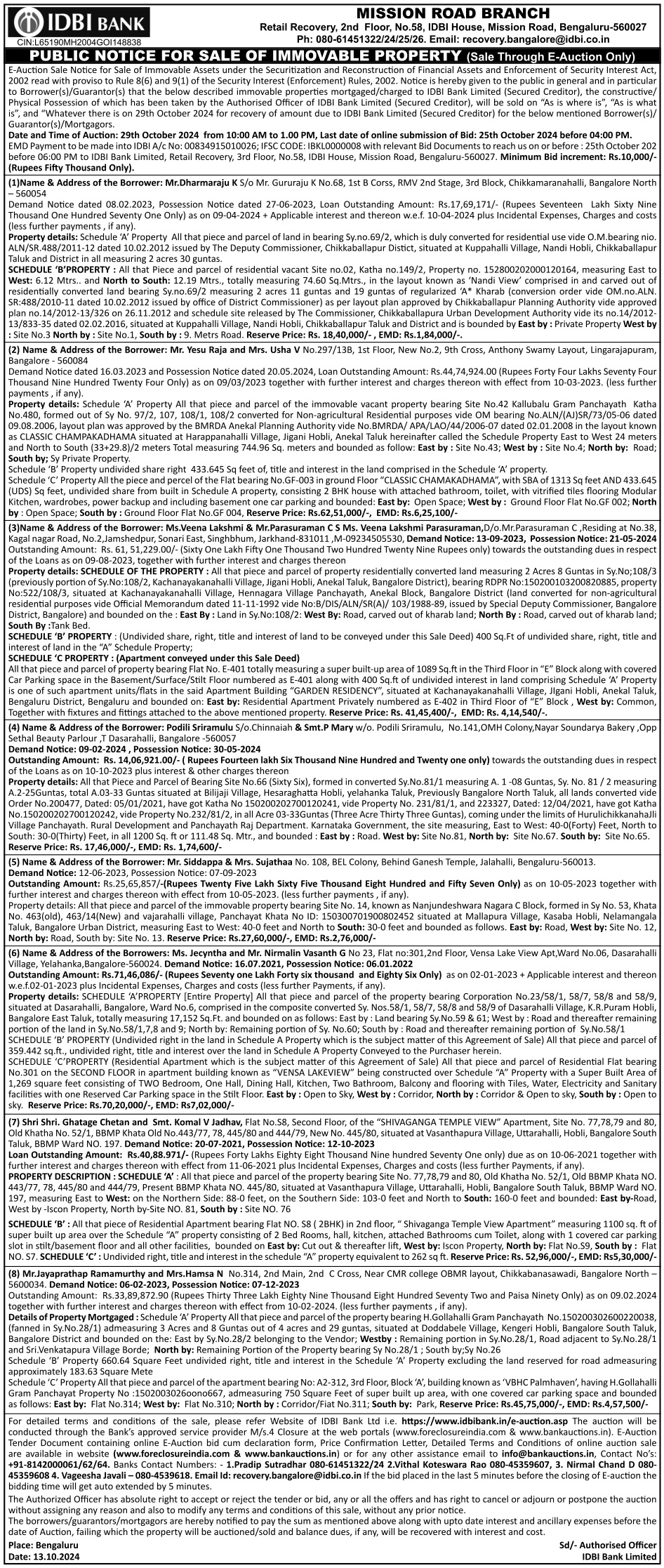 | Contact Details: | Contact The Authorized Officer: 1.Pradip Sutradhar: Ph No: 080-61451322/24 2.Vithal Koteswara Rao Ph No: 080-45359607, 3. Nirmal Chand D Ph No: 080- 45359608 4. Vageesha Javali - Ph No: 080-4539618. Email Id: recovery.bangalore@idbi.co.in |