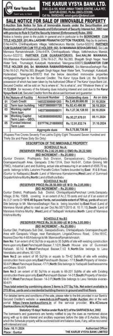 | Schedule of Property: | Guntur District Prathipadu Sub District Chintapallipadu Panchayt Limits, Garapadu Village D No 158/B covering in an extent of Ac.2.78 cents and out of it an extent of Ac 0.21 cents Or 1016.40 Square Yards, net available extent of 709 sq. yards of vacant Site belongs to Mr Mannava Seshagiri Rao is being bounded by East Road (Land of Mannava Murali gifted to road as per Doc No 5571/2015 dt. 10.11.15) South Land of Mannava Krishna Murthy West: Land of Yadlapalli Venkatrao North Land of Mannava Krishna Murthy |
