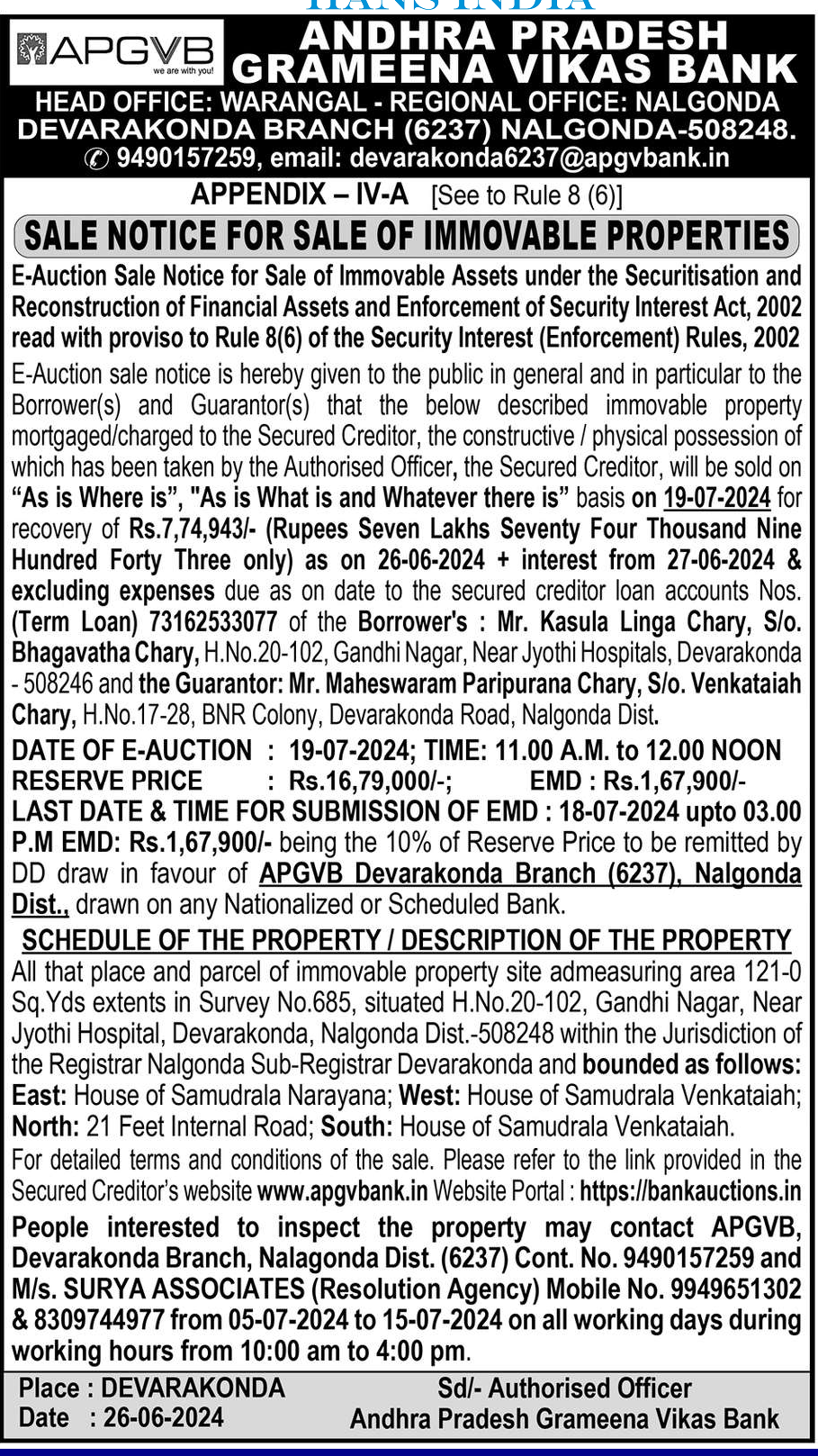 | Contact Details: | Contact The Authorized Officer Phno : Devarakonda 9490157259 , 9949651302 Email: devarakonda6237@apgvbank.ir |