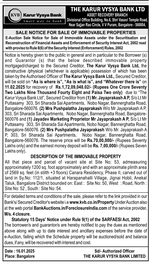| Schedule of Property: | All that piece and parcel of vacant site at Site No: 53, admeasuring approximately 1200 sq. foot approximately and with an approximate plinth area of 2569 sq. feet (in stilth +3 floors) Canara Residency, Phase II, carved out of land in Sy.No: 112/1, situated at Harapanahalli Village, Jignai Hobli, Anekal Taluk, Bangalore District bounded on: East: Site No: 50, West Road, North: Site No: 52, South: Site No: 54. |