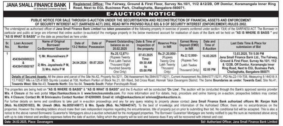 | Contact Details: | Contact The Authorized Officer:Mr. Ranjan Naik (Mob. No.6362951653), Mr. Umesh (Mob. No.8050149617) & Mrs. Syeda (Mob. No.7400445147). |