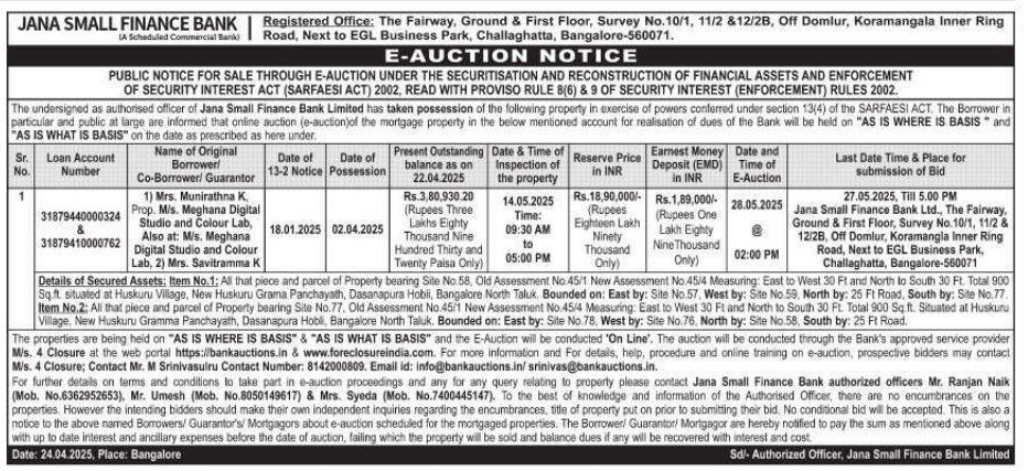 | Schedule of Property: | Details of Secured Assets: Item No.1: All that piece and parcel of Property bearing Site No. 58, Old Assessment No 45/1 New Assessment No.45/4 Measuring: East to West 30 Ft and North to South 30 Ft. Total 900 Sq.ft. situated at Huskuru Village, New Huskuru Grama Panchayath, Dasanapura Hobli, Bangalore North Taluk. Bounded on: East by: Site No.57, West by: Site No.59. North by: 25 Ft Road, South by: Site No.77. Item No.2: All that piece and parcel of Property bearing Site No.77. Old Assessment No.45/1 New Assessment No.45/4 Measuring: East to West 30 Ft and North to South 30 Ft. Total 900 Sq.ft. Situated at Huskuru Village, New Huskuru Grama Panchayath, Dasanapura Hobli, Bangalore North Taluk. Bounded on: East by: Site No.78, West by: Site No.76. North by: Site No.58. South by: 25 Ft Road |