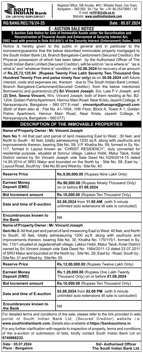 | Schedule of Property: | Item No 2: All that part and parcel of land measuring East to West: 40 feet, and North to South: 30 feet, totally admeasuring 1200 sq.ft. along with usufructs and improvements thereon, bearing Site No. 30, Khatha No. 175/115/1, formed in Sy.No. 115/1 situated at Jagadenahalli village, Lakkur Hobli, Malur Taluk, Kolar District owned by Sri Vincent Joseph vide Sale Deed No. 1564/2011-12 dated 22.07.2011 of SRO Malur and bounded on the North by : Site No. 29, East by Road, South by Site No. 31 and West by Site No. 55. |