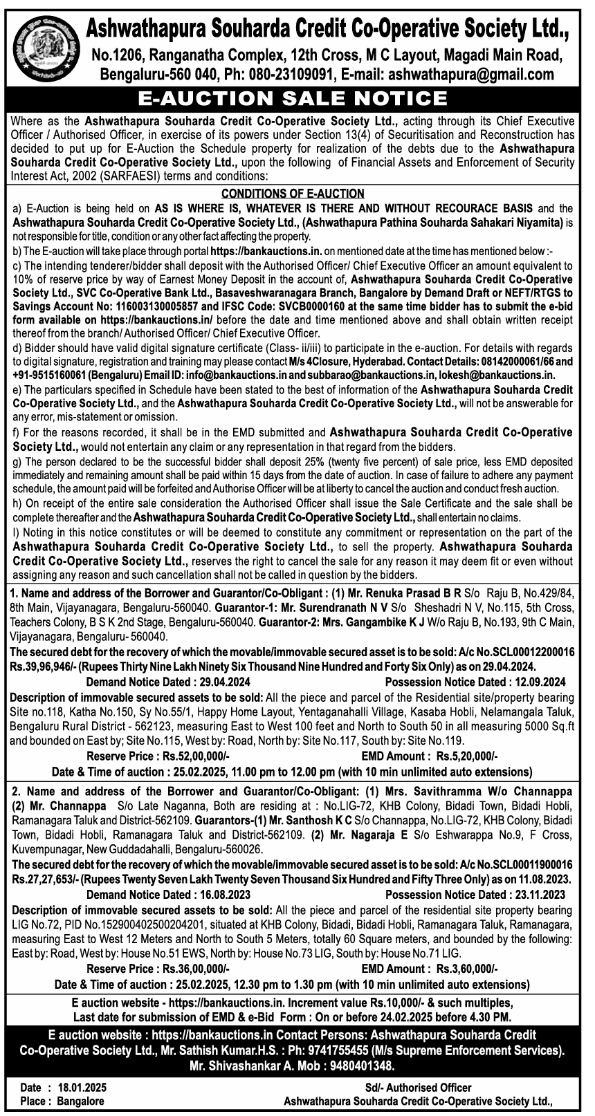 | Contact Details: | Contact The Authorized Officer: 080-23109091, E-mail: ashwathapura@gmail.comMr. Sathish Kumar.H.S. : Ph: 9741755455 ,Mr. Shivashankar A. Mob 9480401348. |