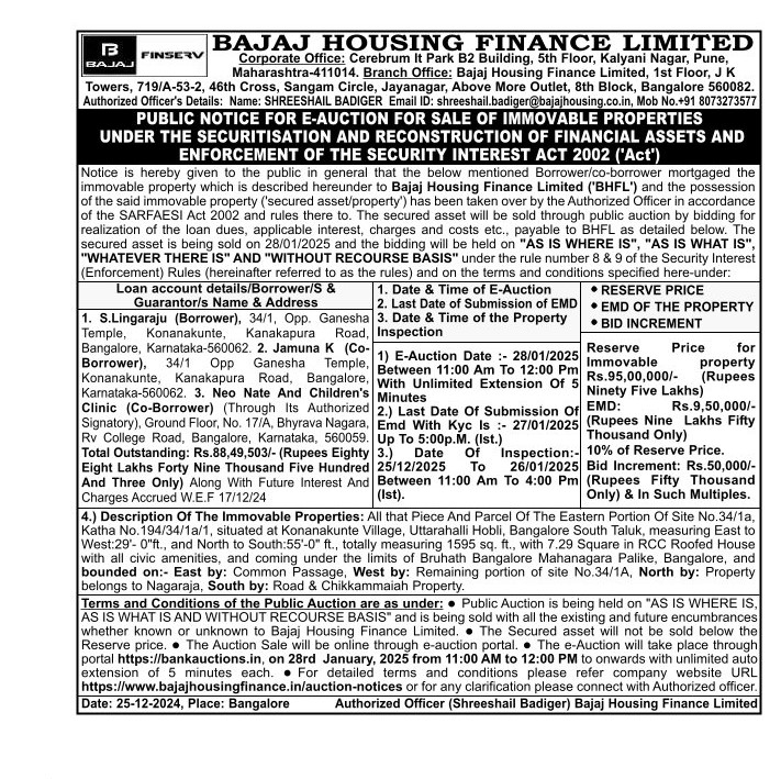 | Contact Details: | Contact The Authorized Officer: Shreeshail Badiger 8073273577/ Email Id :shreeshail.badiger@bajajhousing.co.in |