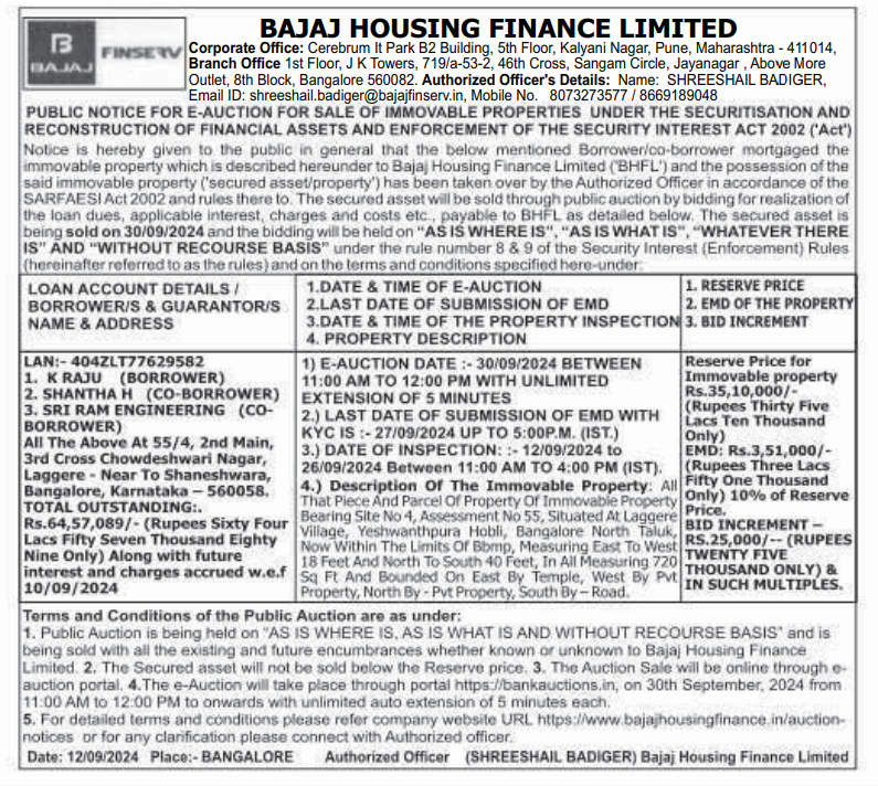 | Contact Details: | Contact The Authorized Officer : SHREESHAIL BADIGER Email ID: shreeshail.badiger@bajajfinserv.in, Mobile No. 8073273577/8669189048 |