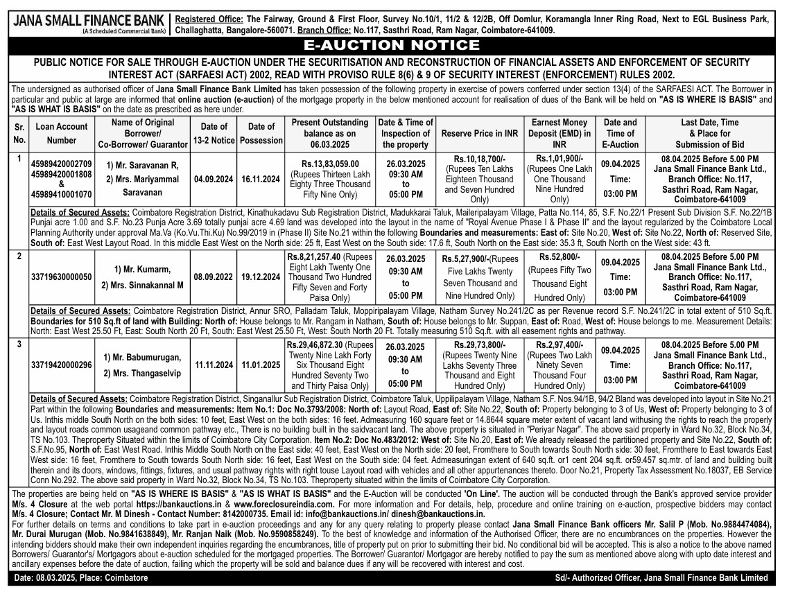| Start Date and Time of Auction: | 09-04-2025 3:00 pm |