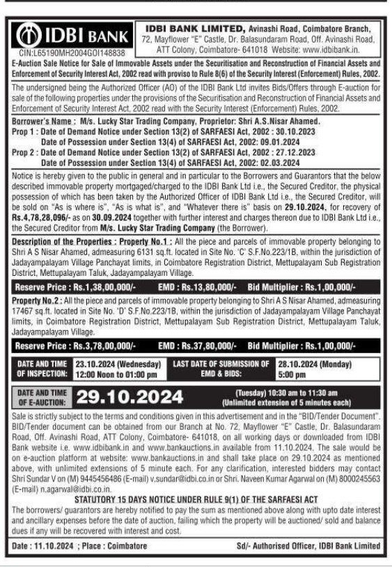 | Contact Details: | Contact The Authorized Officer :Shri Sundar V on (M) 9445456486 (E-mail) v.sundar@idbi.co in or Shri. Naveen Kumar Agarwal on (M) 8000245563 |