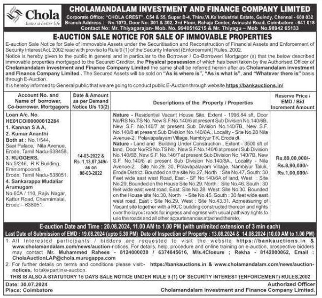 | Schedule of Property: | Nature Residential Vacant House Site, Extent 1996.84 sft, Door No/RS No.TS No. New S.F.No. 140/6 at present Sub Division No. 140/68. New S.F. No.140/7 at present Sub Division No. 140/78, New S.F. No. 140/8 at present Sub Division No. 140/8A., Locality - Site No.28 Nila Avenue-2, Polavapalayam Village, Nambiyur T.K, Erode dt, Nature - Land and Building Under Construction, Extent - 3500 sft of land, Door No/RS No.TS No. New S.F.No. 140/6 at present Sub Division No.140/6B, New S.F. No. 140/7 at present Sub Division No. 140/7B, New S.F. No.140/8 at present Sub Division No.140/8A., Locality Nila Avenue-2. Site No.29, 30, Polavapalayam Village, Nambiyur Taluk, Erode District. Bounded on the site No.27, North Site No.47, South: 30 Feet wide east west Road, East - SF No.140/6A of land, West: Site No.29, Bounded on the House Site No. 29. North: Site No.46. South: 30 feet wide east west road, East: Site No.28. West: Site No.30. Bounded on the House site No.30, North-Site No.45, South: 30 feet wide east west road, East: Site No.29, West: Site No.43,31. Admeasuring of Vacant site together with a RCC building constructed thereon and rights over the layout roads for ingress and egress with usual pathway rights to use the roads and all other appurtenances attached thereto, |