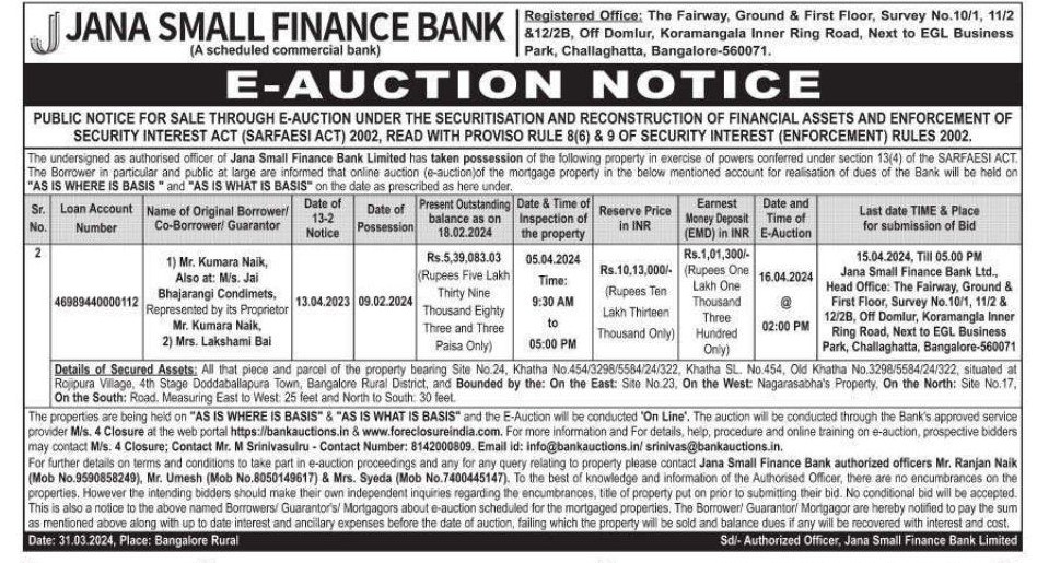 | Contact Details: | Contact Authorized Officer : Mr. Ranjan Naik Mob.No.:9590858249 , Mr. Umesh Mob.No.:8050149617 , Mrs. Syeda Mob.No.:7400445147 |