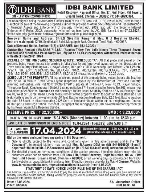 | Contact Details: | Contact Authorized Officer : Mrs. R. Aparna DGM Mob.No.:9444960606 , Mr. S. P.Saravanan AGM Mob.No.:7373014444 |