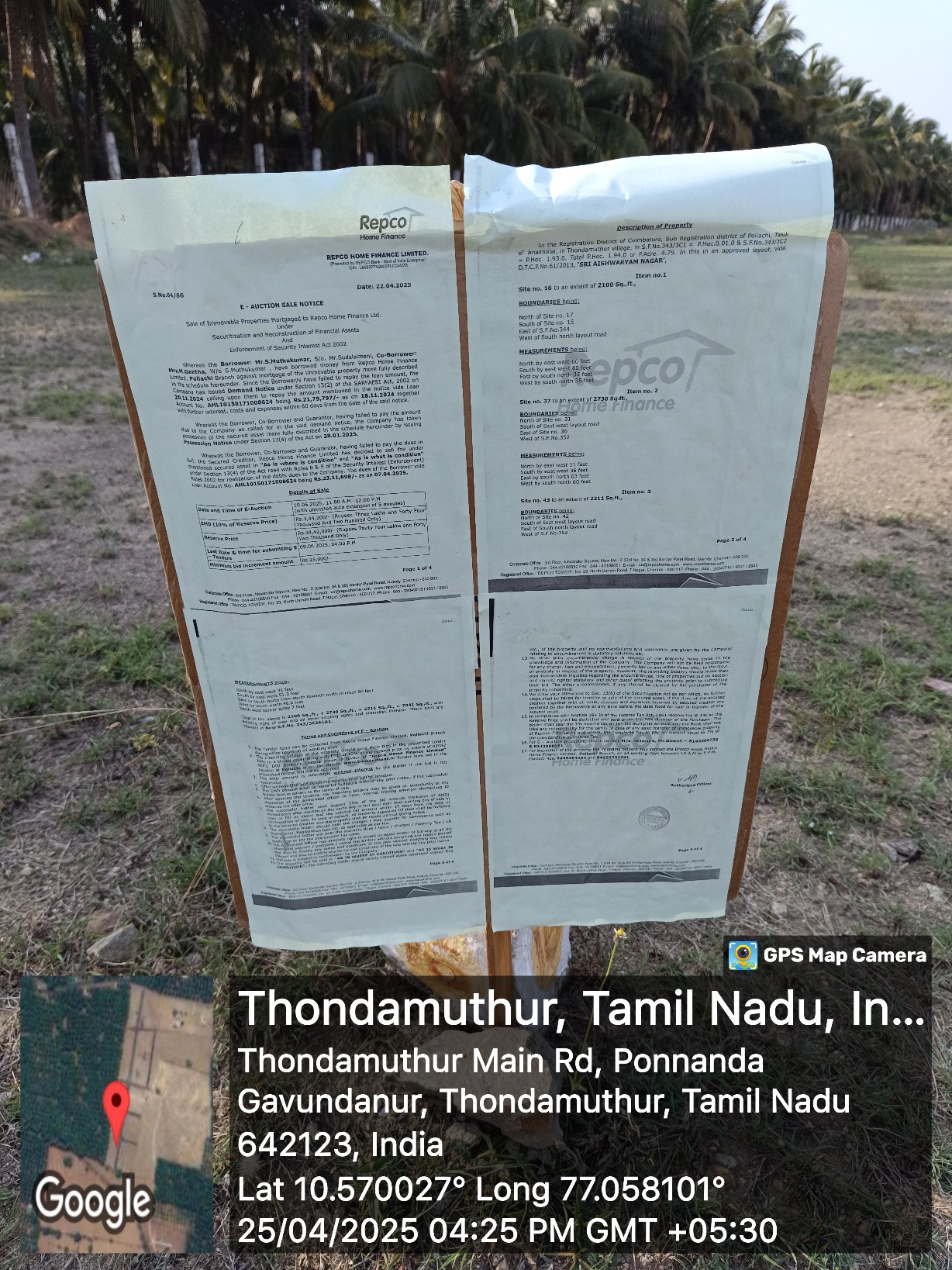 | Schedule of Property: | In the Registration District of Coimbatore, Sub Registration district of Pollachi, Taluk of Anaimalai, in Thondamuthur village, is S.F.No. 343/3C1 P.Hec.0.01.0 & S.F.No.343/3C2 P.Hec. 1.93.0. Total P.Hec.1.94.0 or P.Acre. 4.79. In this is an approved layout, vide D.T.C.P.No.61/2013, SRI AISHWARYAM NAGAR, Item no.1 site no.16 an extent of 2100 sq.,ft., Boundaries being North of Site no.17 South of Site no. 15 east of S.F.No.344 west of South north layout raod, MEASUREMENTS being North by east west 60 feet south by east west 60 feet East by south north 35 feet west by south norht 35 feet, Item no.2 site no.37 to an extent of 2730 sq.ft., BOUNDARIES being North of Site no.31 South of East west layout road East of site no.36 west of s.f.NO.352, MEASUREMENTS being , North by east west 55feet south by east west 36feet east by south north 63 feet west by south north 60feet, Item no.3 site no.43 to an extent of 2211 sq.fet., boundaries being north of site no.42 south of east west layout road east of south north layout road west of S.F.No.353, Measurements being north by east west 31feet (Full details available in sale notice)