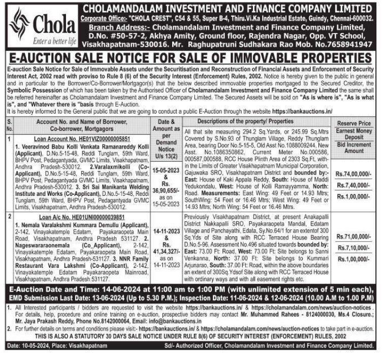 | Contact Details: | Contact The Authorized Officer: Mr Raghupatruni Sudhakara Rao 7658941947, Mr Muhammed Rahees - 8124000030 |