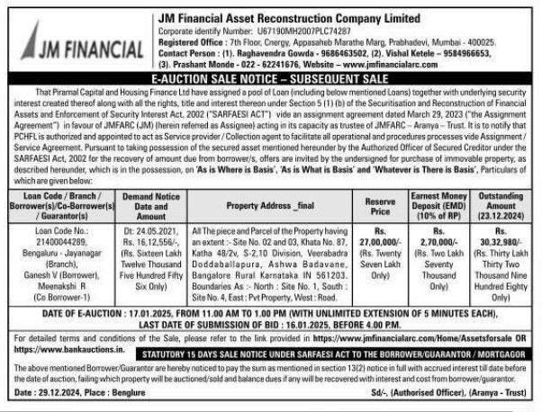 | Start Date and Time of Auction: | 17-01-2025 11:00 am |